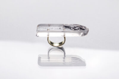 Museum of Decorative Arts and Design in cooperation with the Latvian Jewellery Art Association, is organizing the project “Spectrum”, which will present four pop-up exhibitions sequentially throughout 2026. On March 25, the first exhibition, “Rok-raksts” (“Handwriting”), will open, featuring all artists of the Latvian Jewellery Art Association. Anna Fanigina will present a special ring AQUA made of electrum with a laser engraving on a rock crystal “ἄριστον μὲν ὕδωρ / The best thing in the world is water” (Pindar).