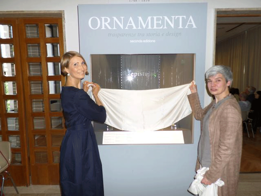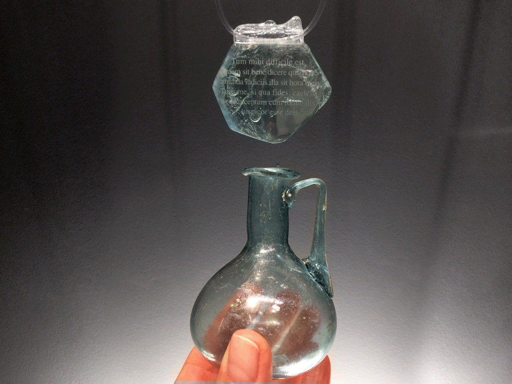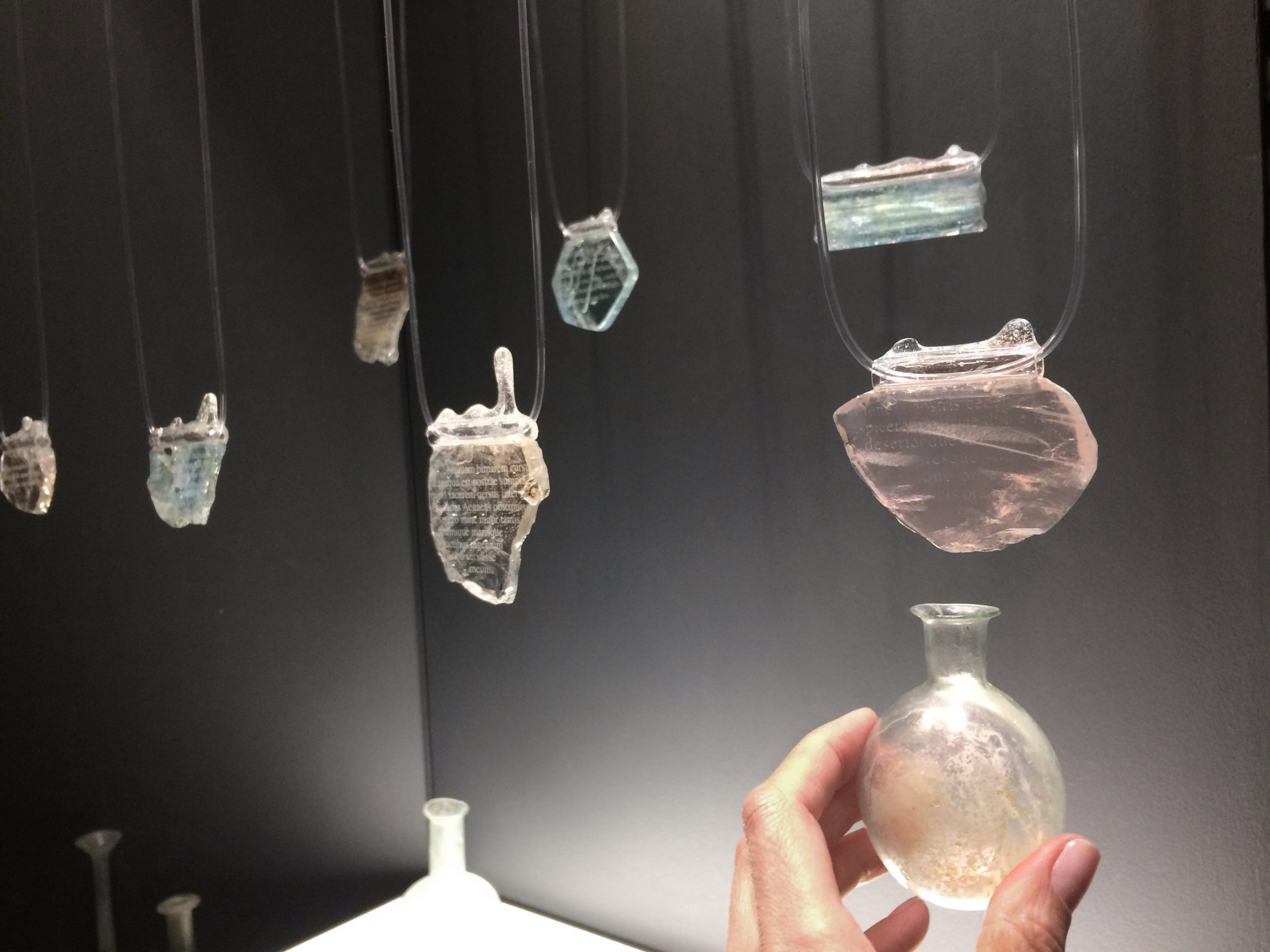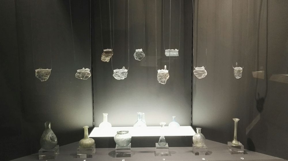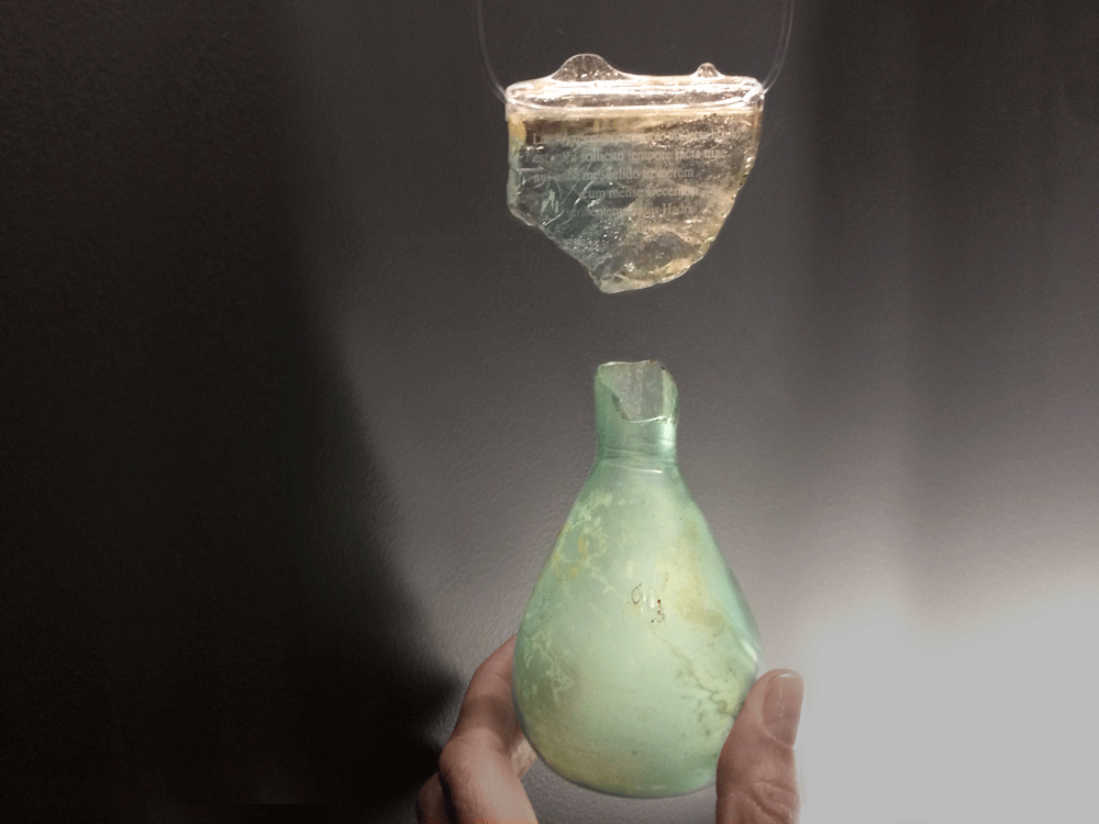 At the exhibition all necklaces are inspired and presented together with the objects of the ancient glass. Translucent blue blown glass balsamarium with a handle. Roman age (1st century AD); necropolis of Ca ’Cima. / На выставке украшения представлены вместе с предметами античного стекла. Полупрозрачный голубой бальзамарий из дутого стекла с ручкой. Древний Рим, 1 век н.э., некрополь Ca’ Cima. / Balsamario a bottiglia monoansata in vetro soffiato di colore azzurro traslucido. Età romana (I sec. d.C.); necropoli di Ca’ Cima.