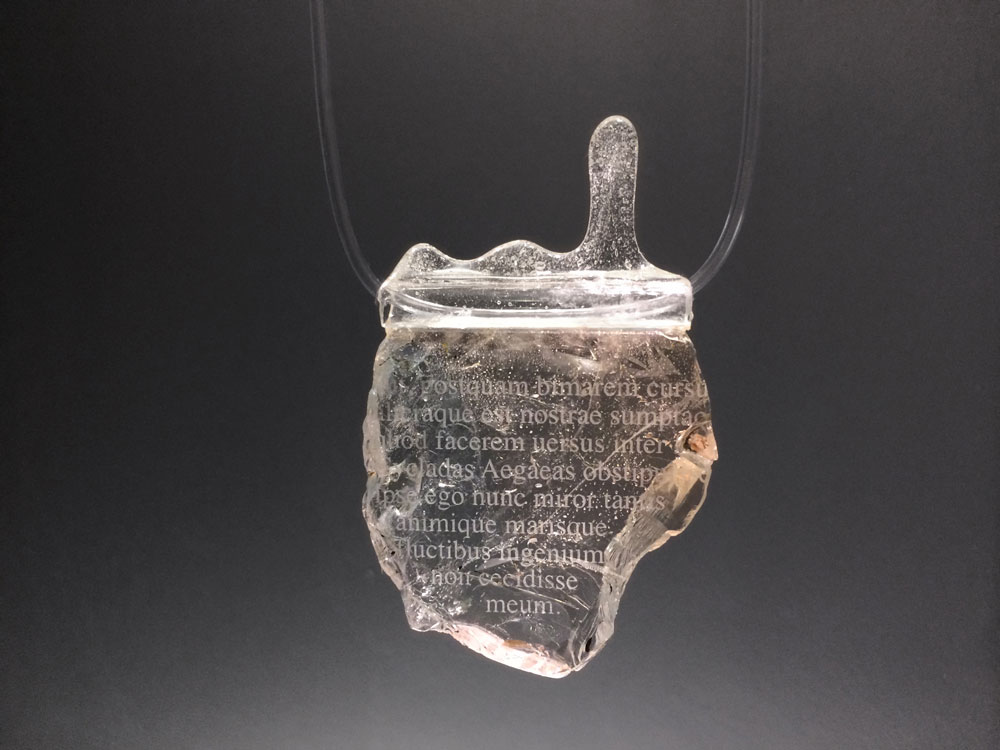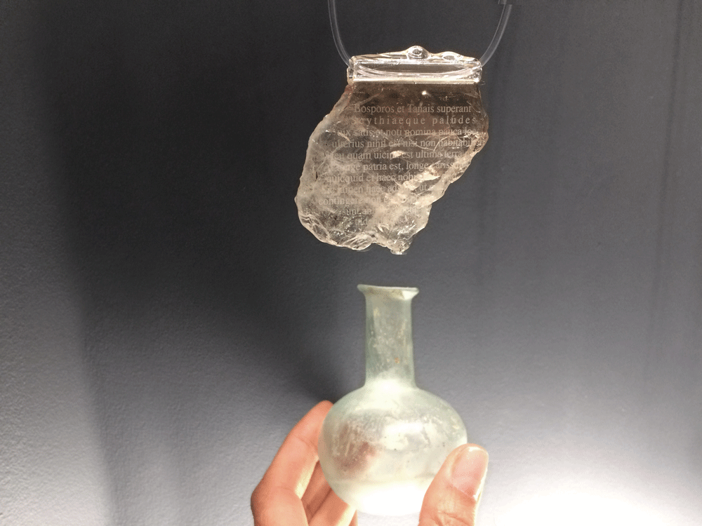 Коллекция подвесок из прозрачных, почти необработанных топазов, аквамаринов и кварцев с лазерными гравировками стихов Овидия былa создана для инсталляции в Национальном Археологическом Музее Адрии (Италия) в 2019 году, где экспонировалась вместе с сосудами из древнеримского стекла 1 в. н. э. Каждому украшению соответствовал свой сосуд, давая отсыл к традиции отправлять в море письма в бутылках будущим поколениям. Прозрачные подвески то ли как окаменевшие воды бушующих стихий, через которые рискуя жизнью добирался поэт до места ссылки, то ли как куски льда, впервые увиденного и поразившего поэта на севере, то ли как застывшие накопленные слезы, превратившиеся в поэмы. Это разговор о превращениях хрупкого и крепкого, текучего и твердого, вечного и частного. Откровения Овидия, снова и снова доходящие до нас через тысячелетия, удивительным образом действительно даруют утешение и надежду. Мы понимаем, что не одиноки в своем одиночестве, боль каждого из нас, по большому счету, не нова, а искусство — то лекарство, тот эликсир, врачующий мировые раны и сохраняющий хрупкие ценности цивилизации.