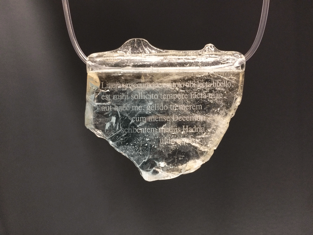 «Every letter that you have read in my whole book was formed by me during the troubled days of my journey. Either the Adriatic saw me writing these words in the midst of his waters, while I shivered in cold December.» Ovid, «Sorrows», book I / 11 (topaz, plexiglass, resina) / «Все до последней строки, что прочтешь ты в книжечке этой, Все написано мной в трудных тревогах пути. Видела Адрия нас, когда средь открытого моря Я в ледяном декабре дрог до костей и писал.» Овидий, «Скорбные элегии», книга I / 11 (топаз, органическое стекло, резина) / “Ogni lettera che tu hai letto in tutto il mio piccolo libro, io l’ho scritta durante i giorni angosciati del viaggio. O questi versi mi vide scrivere in mezzo alle sue onde l’Adriatico, mentre tremavo al freddo di dicembre.” Ovidio “Tristezze”, libro I / 11 (topazo, plexiglass, resina)