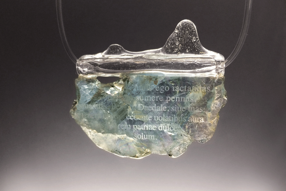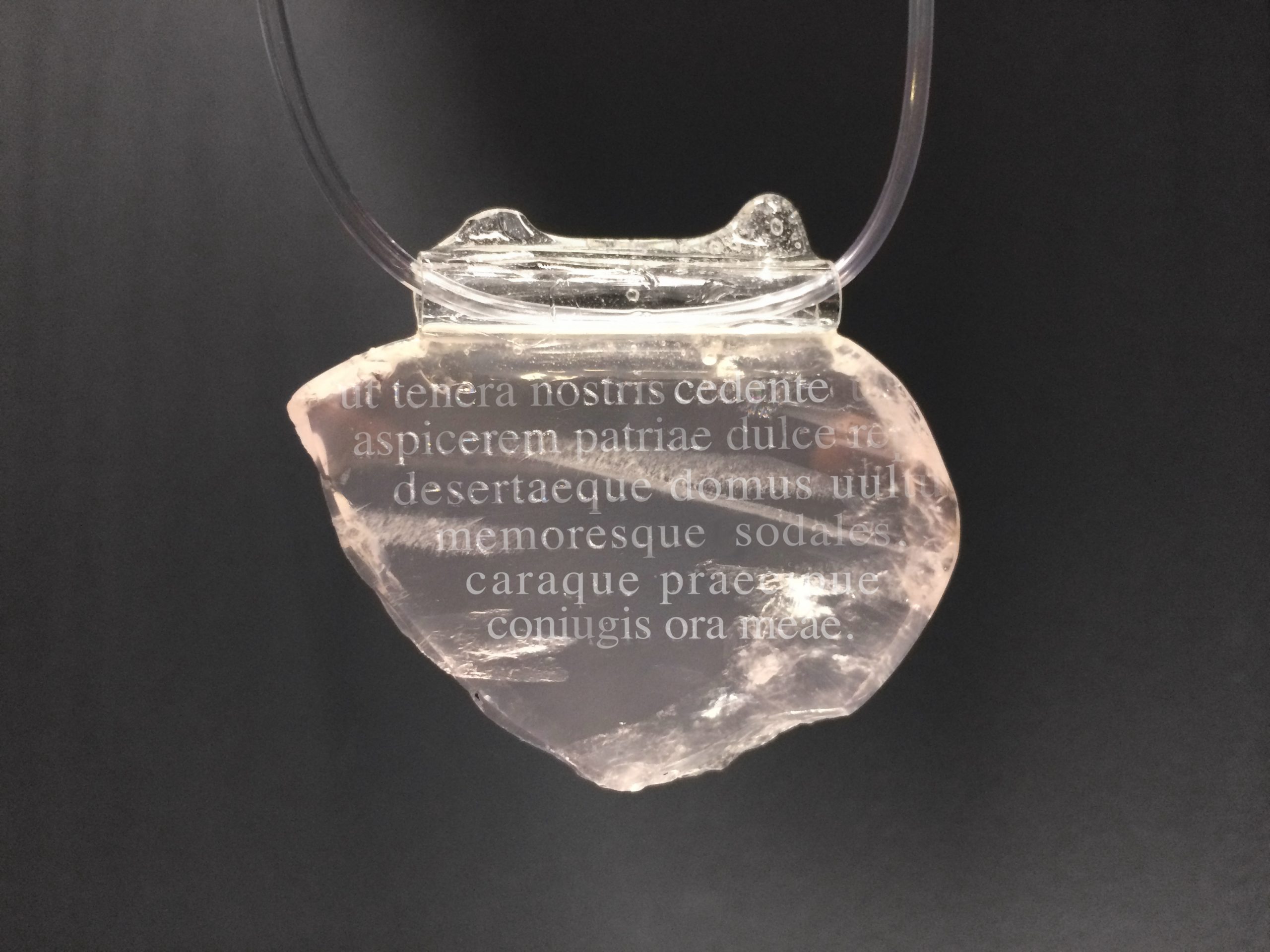 «Whatever I say shall pass to the setting sun from its rising and the East shall bear witness to the voice of the West. Across the land, across deep waters I shall be heard, and mighty shall be the cry of my lament.» Ovid, «Sorrows» Book IV/9 / (aquamarine, plexiglass, resina) «Ibit ad occasum quicquid dicemus ob ortu, testis et Hesperiae vocis Eous erit. Trans ego tellurem, trans altas audiar undas, et gemitus vox est magna futura mei» Ovidio «Tristia», book IV/9; / (acquamarina, plexiglass, resina) «Что ни скажу, полетит далеко на восток и на запад, В странах восхода внимать будут закатным словам, Буду сквозь толщу земли и сквозь глуби морские услышан, Отзвуком громким в веках каждый отдастся мой стон.» Овидий “Скорбные элегии” Книга IV/9 / (аквамарин, органическое стекло, резина) “Arriverà all’occaso tutto ciò che io dirò dall’oriente, e testimone sarà Eòo di ciò che avrà detto l’Esperia; oltre la terra, oltre gli abissi delle acque sarò udito, e l’eco del mio gemito si farà sempre più grande.» Ovidio “Tristezze”, libro IV/9 / (acquamarina, plexiglass, resina)
