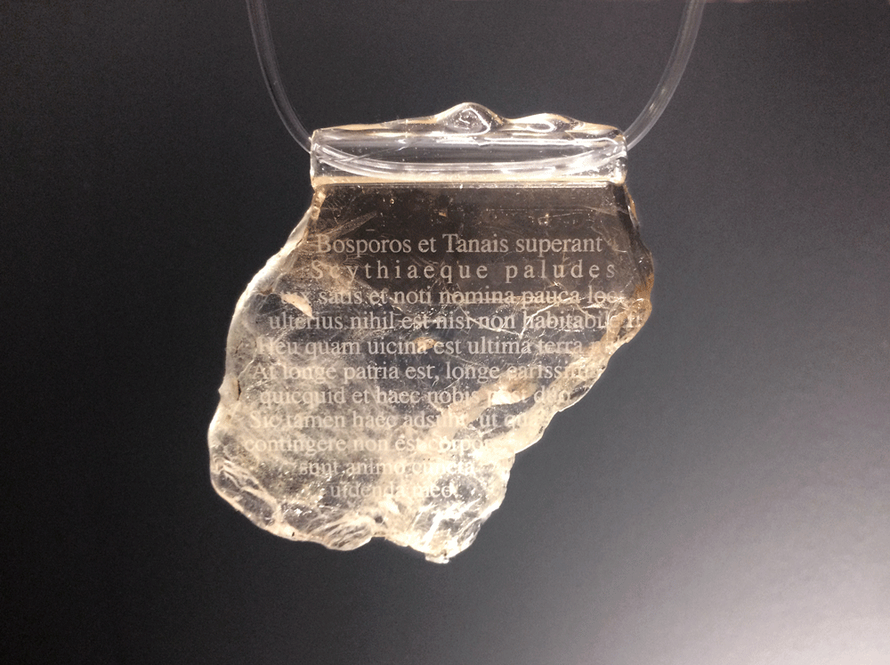 «Beyond are the Bosporus and the Tanais l and the Scythian marshes and the scattered names of a region hardly known at all. Farther still is nothing but a cold that forbids habitation. Alas ! how near to me is the margin of the world ! But my father- land is far away, far my dearest wife, and all that after these two was once sweet to me. Yet even so these things are present, though I cannot touch them; to my mind all are visible.» Ovid, «Sorrows», book III /4 (topaz, plexiglass, resina) / «Дальше — Босфор, Танаис, Киммерийской Скифии топи, Еле знакомые нам хоть по названью места; А уж за ними — ничто: только холод, мрак и безлюдье. Горе! Как близко пролег круга земного предел! Родина так далеко! Далеко жена дорогая, Все, что в мире ценил, чем дорожил, — далеко! Отнято все, но так, что хотя рукой не достанешь, Отнятое могу видеть очами души.» Овидий “Скорбные элегии” Книга III /4 (топаз, оргстекло, смола) / Oltre non resta che il Bosforo, il Tanai e la scitica palude e pochi nomi di località appena note. Più avanti nulla vi è se non l’inabitabile freddo. Ahimè, come mi è vicino l’ultimo lembo del mondo! Lontana invece è la patria, lontana la carissima consorte, e tutto ciò che, dopo di loro, mi era dolce. Queste cose tuttavia sono così presenti, che se non posso toccarle col corpo, tutte le posso contemplare con l’animo. Ovidio “Tristezze”, libro III / 4 / «Bosporos et Tanais superant Scythiaeque paludes uix satis et noti nomina pauca loci. ulterius nihil est nisi non habitabile frigus. Heu quam uicina est ultima terra mihi! At longe patria est, longe carissima coniunx, quicquid et haec nobis post duo dulce fuit. Sic tamen haec adsunt, ut quae contingere non est corpore: sunt animo cuncta uidenda meo.» Ovidio