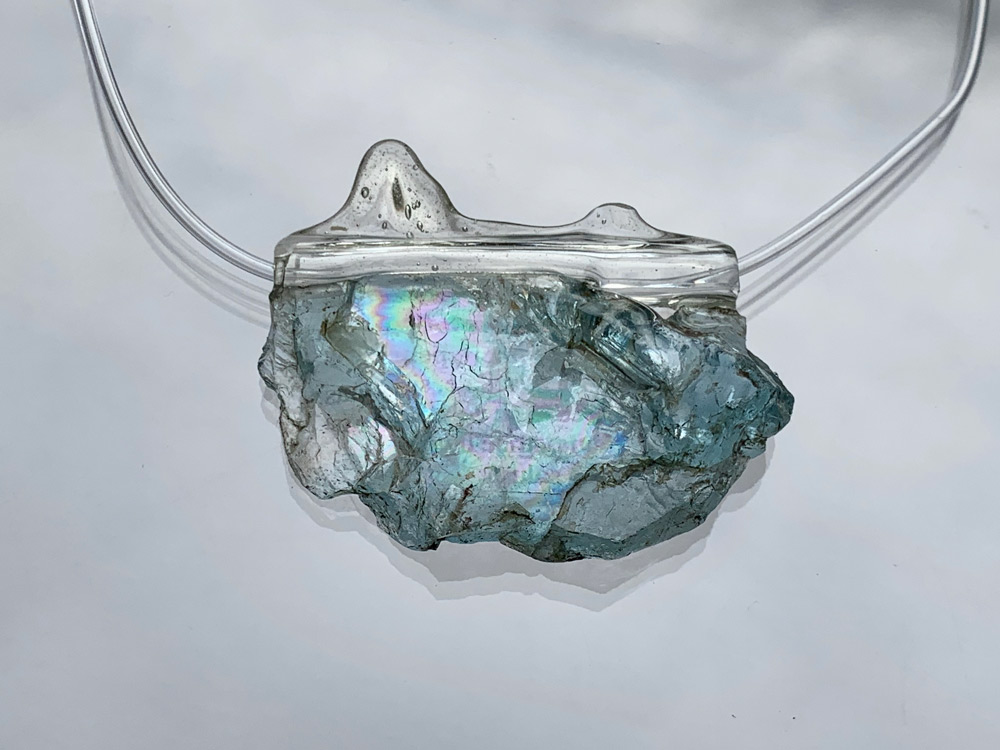 At the exhibition all necklaces are inspired and presented together with the objects of the ancient glass. Translucent blue blown glass balsamarium with a handle. Roman age (1st century AD); necropolis of Ca ’Cima. / На выставке украшения представлены вместе с предметами античного стекла. Полупрозрачный голубой бальзамарий из дутого стекла с ручкой. Древний Рим, 1 век н.э., некрополь Ca’ Cima. / Balsamario a bottiglia monoansata in vetro soffiato di colore azzurro traslucido. Età romana (I sec. d.C.); necropoli di Ca’ Cima.